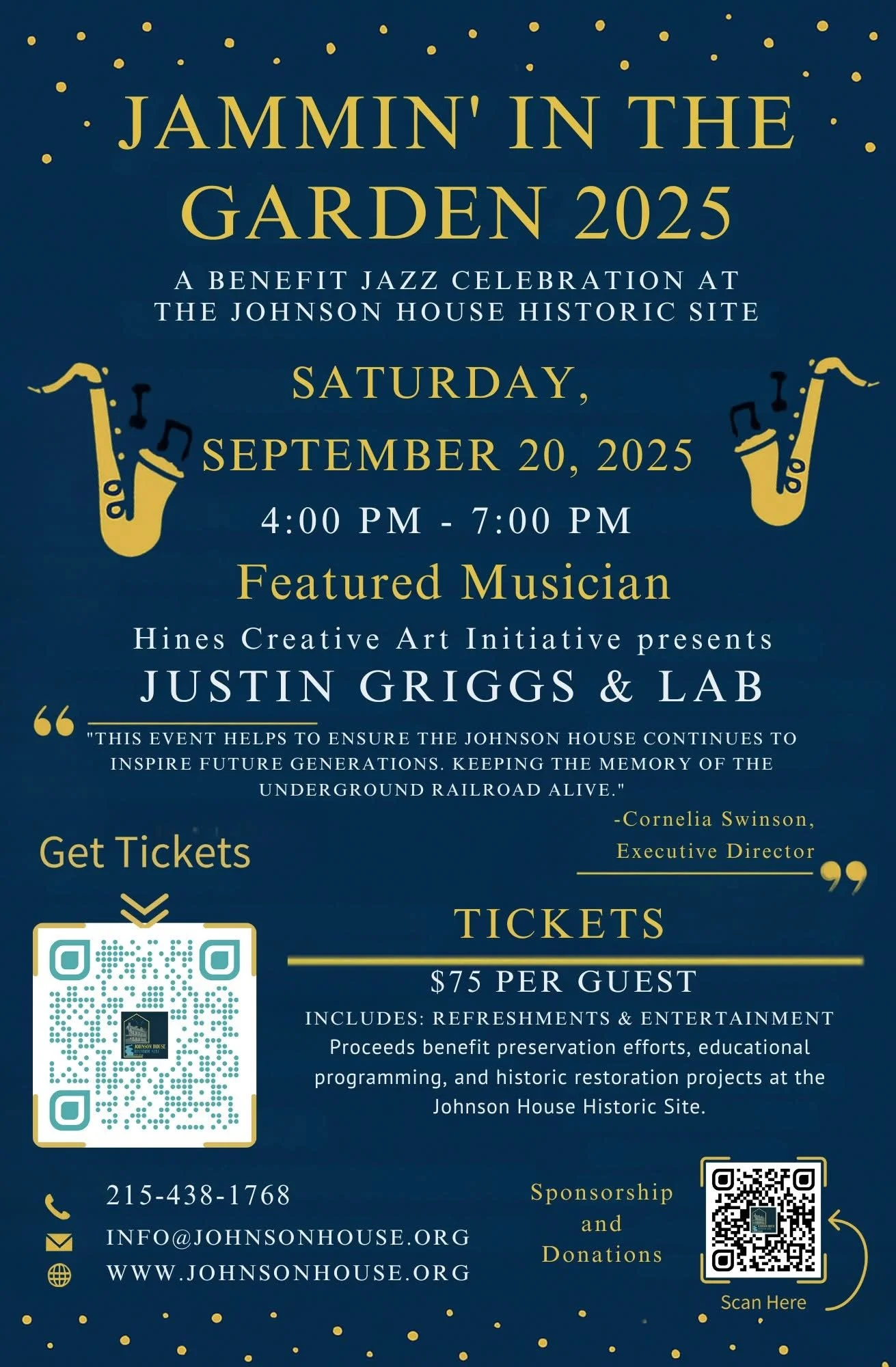 This International Underground Railroad Month, the Johnson House will host a party with a purpose, Jammin’ in the Garden 2025: A Celebration of Music and Community, on Saturday, September 20, 2025, from 4:00pm to 7:00pm. The fundraiser will support their preservation work and the Center for Social Advocacy.